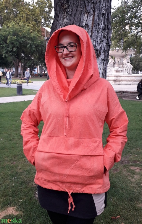 Igazi komfort felső. :) Stílusos, vagány, viselheted szoknyához, farmerhoz, kirándulásra, bringázáshoz. Nagy zsebe remekül kihasználható, kapucniját és az alját saját zsinórjával húzhatod össze.