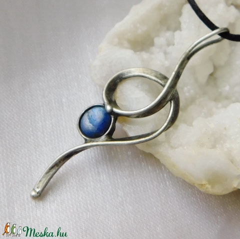 A medál Tiffany technikával készült kianit (disztén) és ólommentes, ezüsttartalmú ón felhasználásával. A díszítés szintén saját készítésű, nem tartalmaz gyári elemeket. A fémrészt óezüstre patináztam és lelakkoztam, hogy sokáig szép maradjon.