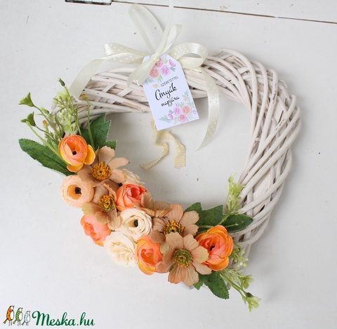 Anyáknai, tavaszi szív alakú virágos KOPOGTATÓ, ajtódísz, koszorú