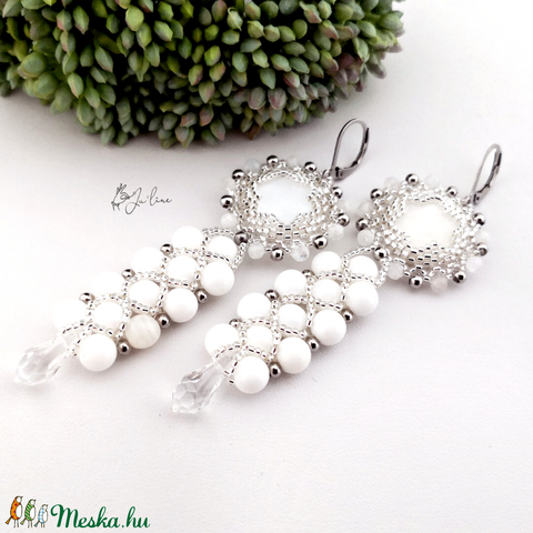 Ez az elbűvölő, holdkővel gazdagított gyöngyház fülbevaló színeiben visszafogott: fehér és áttetsző, ám részletgazdagsága és mérete igen látványossá teszi.