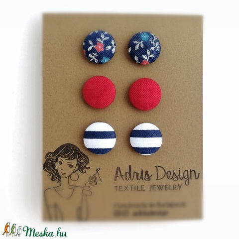 Sötétkék apró virágos, piros, tengerész csíkos kék-fehér Mini vagy Micro textil fülbevaló csomag - 3 pár/csomag