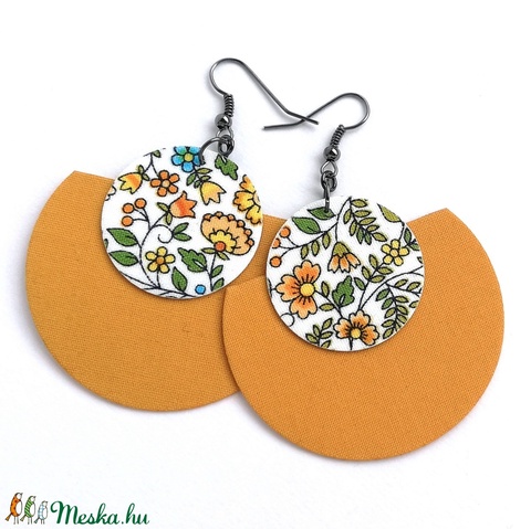 Okkersárga és tavaszi virágmintás Félhold Extra textilfülbevaló