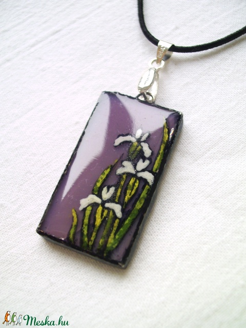 Kézzel festett íriszcsokor, lila tiffany üvegmedál