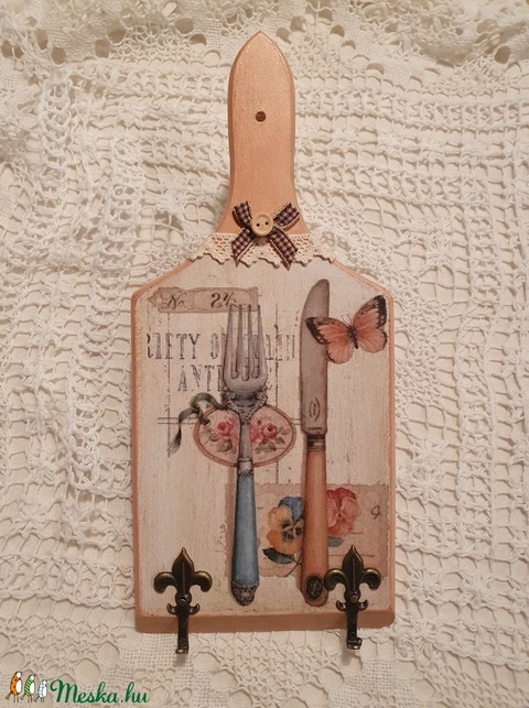 dekupázs papír, lakkok, akril festék, csipkecsík, masni , gomb , fém kiegészítő, fa
