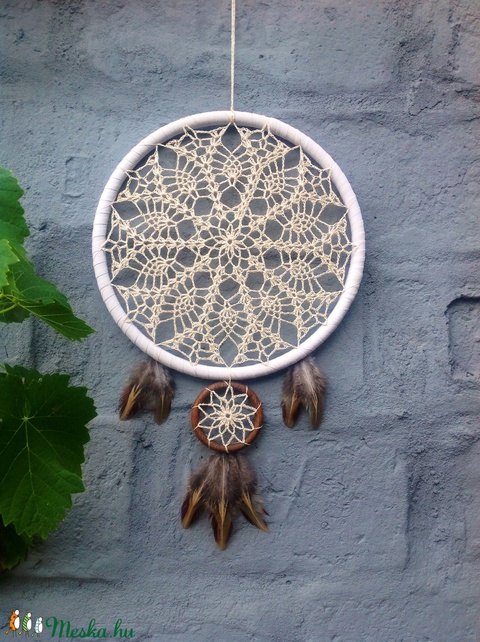 Ekrü színű horgolt álomfogó fácántollakkal