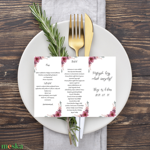 Mályva virágos, álló, háromszög menükártya, szalaggal kötve