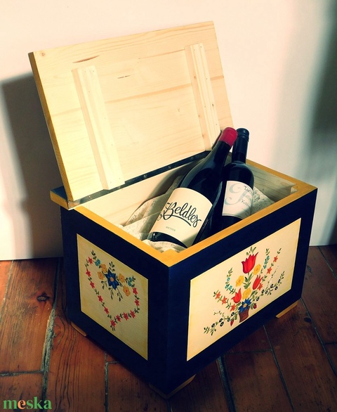 Hagyományos stílusú nagy festett fa láda, tulipános láda, menyasszonyi láda