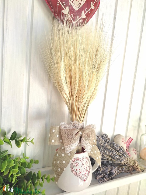 Száraz virág csokor: búza kalász 40 cm magas, natúr pöttyös szalaggal