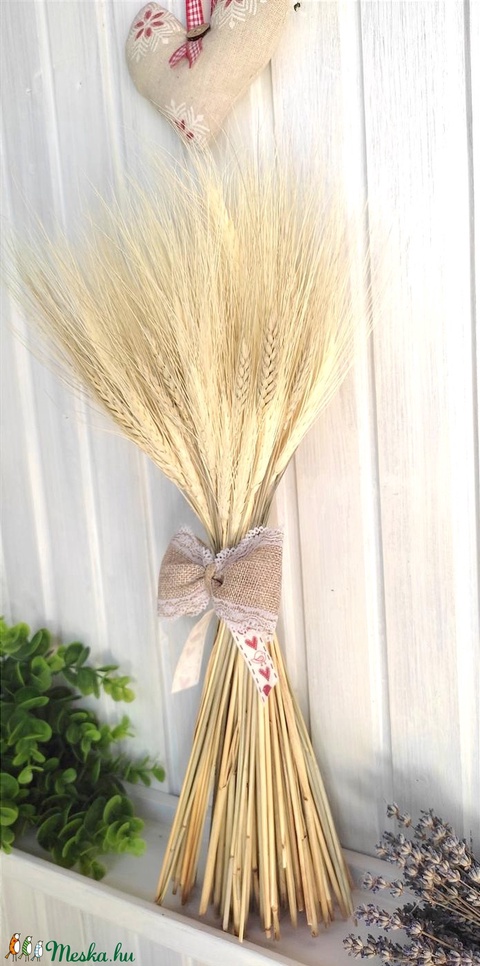 Száraz virág csokor: búza kalász 47 cm magas, natúr és szíves+madaras szalaggal