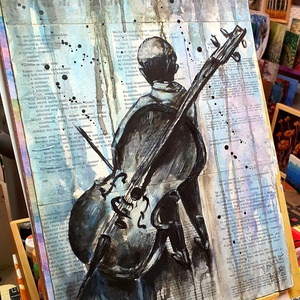 30 x 40 cm -es faroston ( nagyon régi : ) faanyagon olvasnivaló/ tartalma hangulatában most is szèp - M. Quoist : Itt vagyok, Uram ! című könyve / , rajta festés, akrillal, tustintával, a fő téma most a zene, a zene absztrakt, zene hangulat.