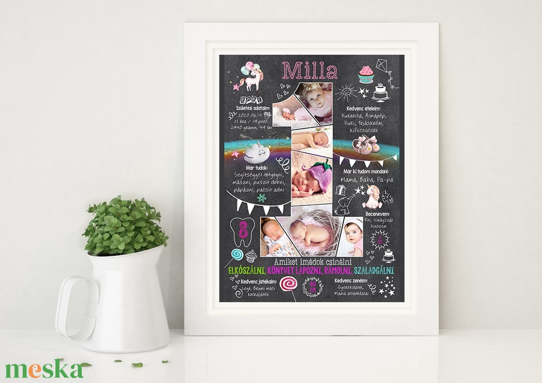 Készülsz a nagy napra? Már 1 éves a kislányod, vagy szeretted gyermeke? Akkor jó helyen jársz. Ez a poszter nemcsak az 1-es számba olvasztja az általad elküldött fotókat, hanem rengeteg adatot is tartalmaz az elmúlt 1 év fontosabb eseményeiről. Ezek nemcsak viccessé válnak az évek múltával, de mindig jó érzés lesz ránézni és nosztalgiázni azon az időszakon, ami most már a múlt egy csodálatos időszakát foglalja össze. Szükséges fotók száma: 7 db.