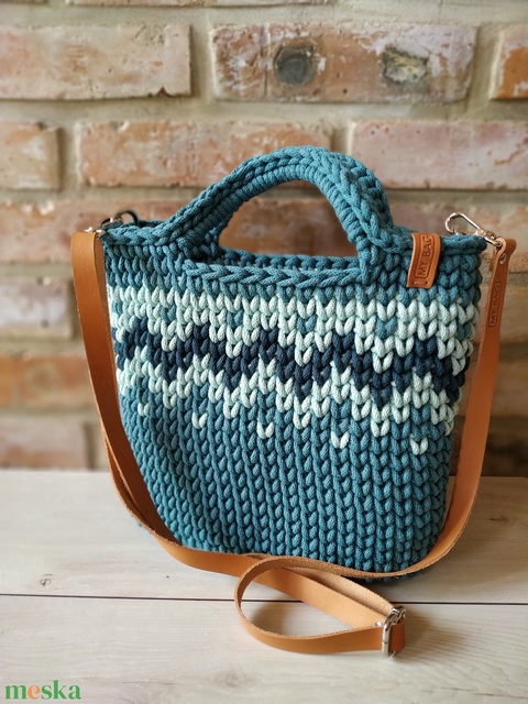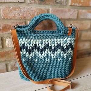 Horgolt női crossbody táska teal színben bőr vállpánttal - Cikk-cakk mintával - BIG