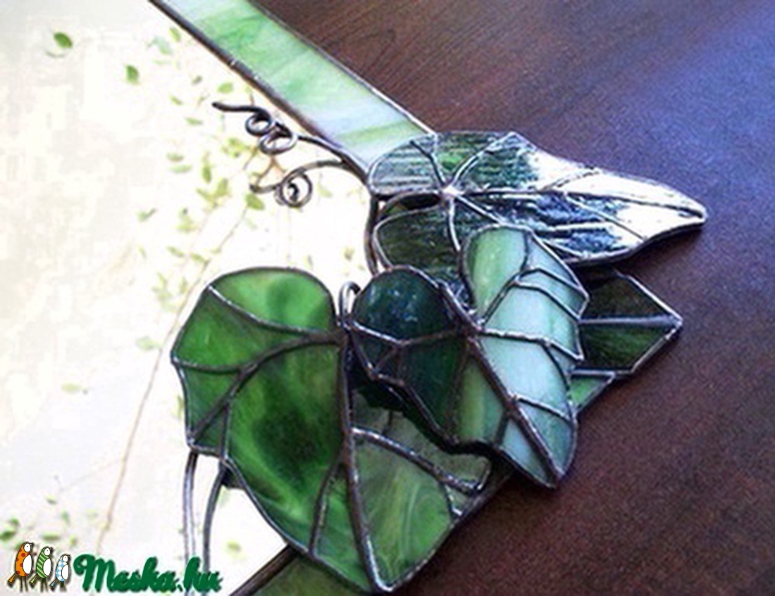 - Anyaga: wissmach üveg zöld, spektrum üveg világoszöld, tükörüveg, réz fólia, ón ólom ötvözet forraszanyag, réz akasztó, patina, u-alakú ólomprofil, réz huzal