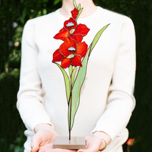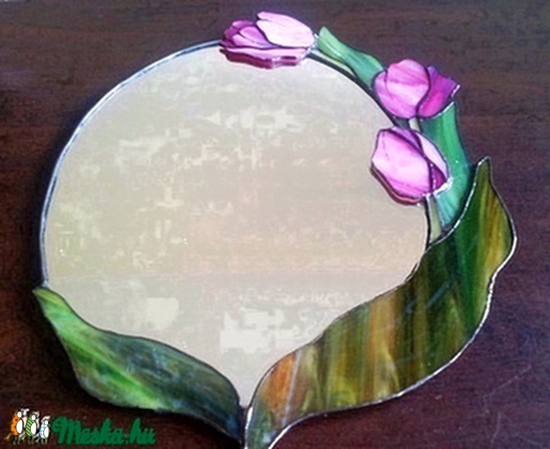 - Anyaga: wissmach rózsaszín, wissmach zöld, tükör, réz fólia, ón ólom ötvözet forraszanyag, patina, réz akasztó, u ólomprofil