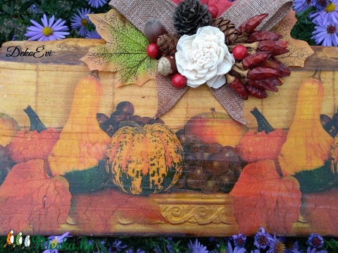Őszi mintával tökmintájú szalvétával díszített, fa lap, van akasztója. Falra lehet akasztani. Méretei 30x15 cm. Postán maradó küldeményként tudom postázni.