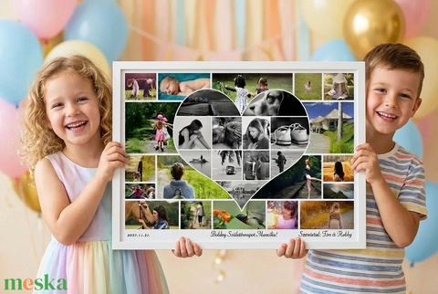 Szív alakú fényképes szülinapi poszter Szíves fotókollázs Elmondanád mennyire szereted? Sok-sok gyönyörű fotó készült az esküvőtökön, vagy a szeretteidről? Kerek évfordulóra, születésnapra készülsz? Beszéljenek helyetted a sok-sok gondosan kiválogatott fotók? Akkor válaszd ezt a szív alakú montázst. A középen lévő szívecskét fekete-fehér fotók díszítik, de természetesen ha színesben szeretnéd, úgy is készülhet.