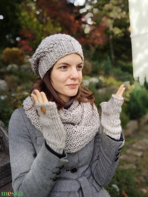 Női gyapjús téli szett - kézzel kötött szürke meleg sapka sál körsál - vastag meleg puha fonal