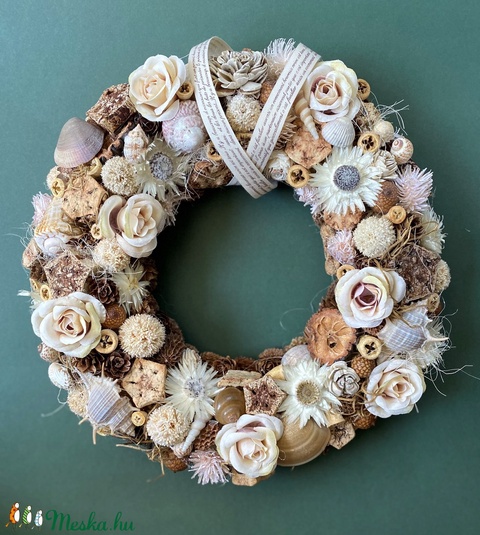 termések, szalmakoszorú, kagyló, selyemvirág, csigaház, kagyló