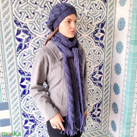 Dotta sapka sál szett - farmerkék puha meleg fonalból - kézzel kötött vastag gyapjús fonalból