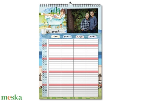 A családi rendező naptár egy olyan eszköz, amely 1 éven keresztül gyűjti össze családtagjaid tevékenységeit, programjait. Hiszen ki ne tudná milyen nehéz időnként a családot koordinálni ebben a rohanó világban, ahol rengeteg a tanfolyam, iskola utáni tevékenység, vagy hétvégi elfoglaltság. Mindenki saját oszlopban rögzítheti az eseményeket, átlátva így a másik programjait is. Minden hónap fényképes részét egyedi design teszi még vidámabbá.