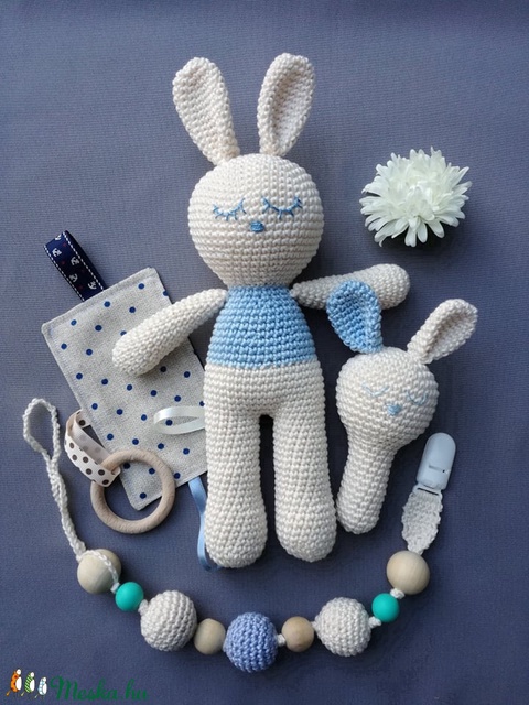 Ha már a pocakodban van és szeretnél neki egy különleges, egyedi, szeretettel készült ajándékot, amelyet piciként, kicsiként és nagyobbacskaként is fog tudni használni, akkor válaszd neki ezt a babaváró szetet! Vagy ajándékot keresel egy kedves ismerős, családtag babájának érkezésére? Nézd ezeket a nyuszikat! A szet része egy nyuszifigura, amely kb. 27-28 cm magas. A szemei és az orra hímezve vannak, belsejében szilikonizált poliészter van. A pici nyuszi egy csörgő, melynek a hangja kedves, csendes, nem irritáló. Magassága kb. 15 cm, kényelmes fogás van rajta egy babamarok számára. A szemei és az orra hímezve vannak, belsejében szilikonizált poliészter van. A csomagban van még egy rongyi, ami nagyon jól fog jönni fogzáskor, de játéknak sem utolsó. Egy cumitartó rágcsalánc tartozik még az ajándékhoz. Ezt egy csatt segítségével tudod a kicsi ruhájára csíptetni, így nem hagyjátok el a cumit. De ha nem is cumizik, a színes, természetes vagy bababarát anyagokból készült golyók sok ideig lefoglalják a gyereket. A láncon fa- és szilikongolyók vannak. A horgolt részek 100%-os pamutfonalból készültek.