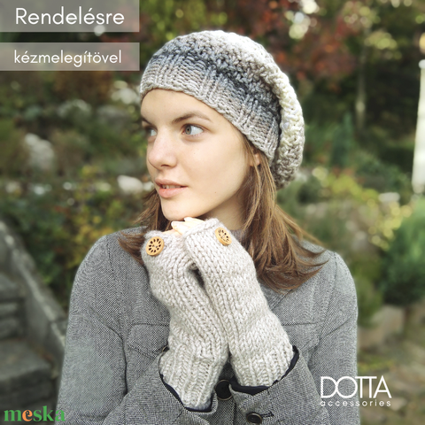 NŐI sapka, meleg sapka, szürke sapka, meleg szett sapka, sapka kézmelegítő szett, kézzel kötött sapka, exkluziv sapka, téli sapka szett