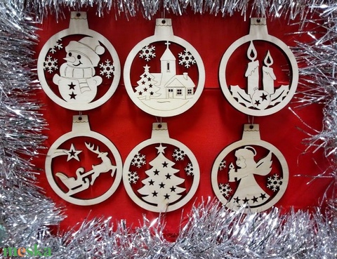 6 darabos szett:Áttört mintás karácsonyfadíszek fából