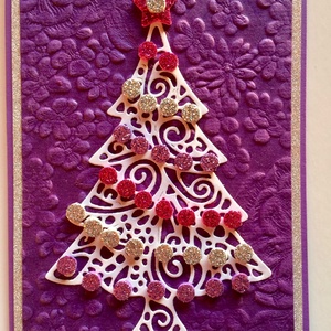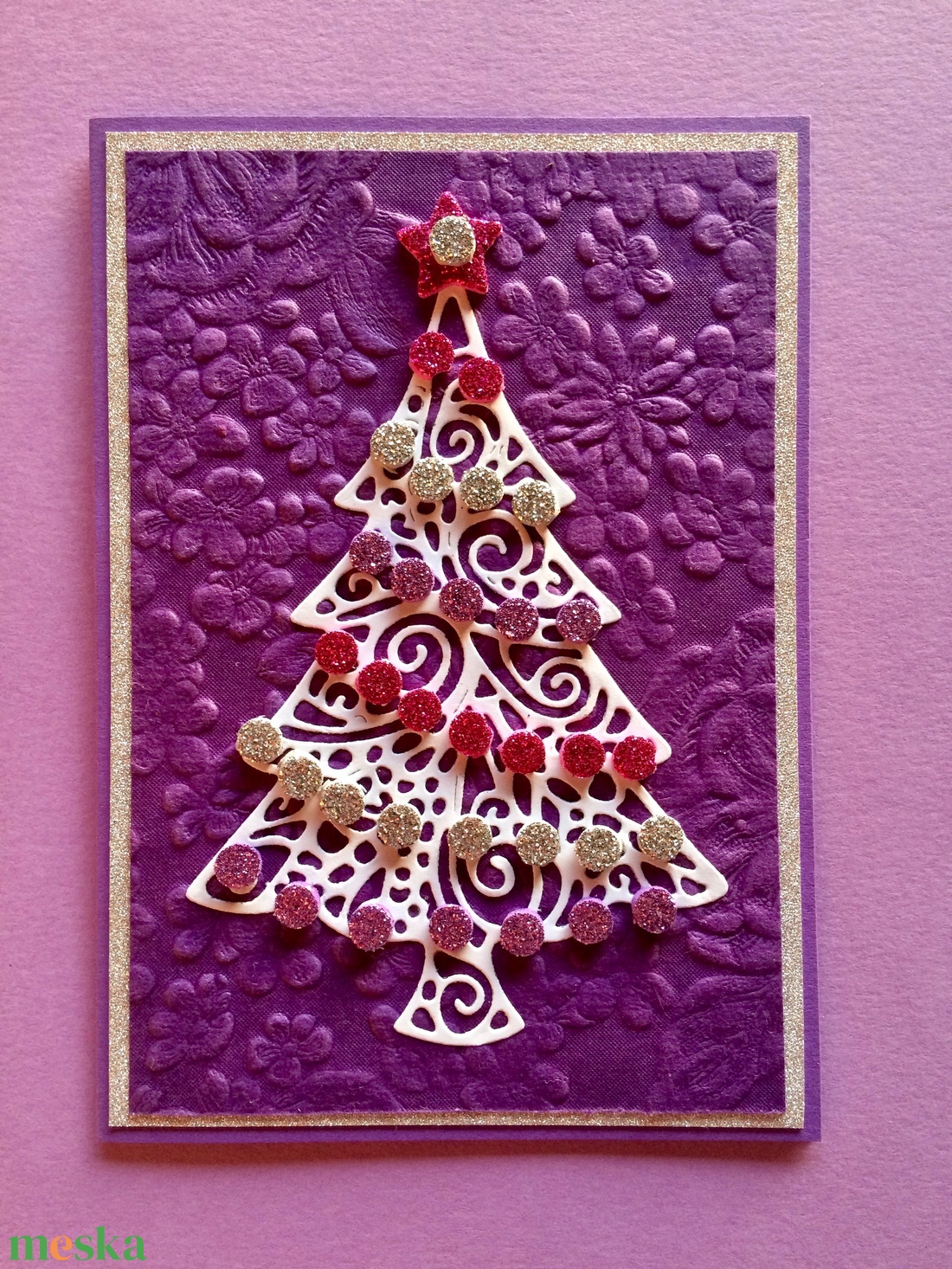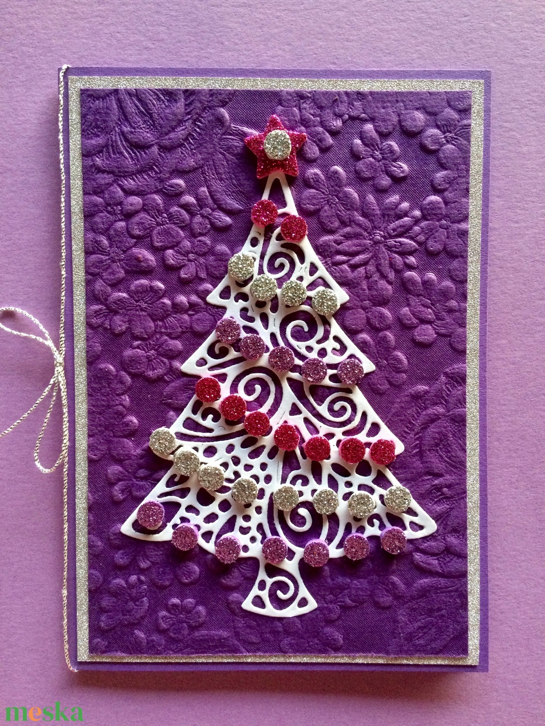 "Lila karácsony" karácsonyi képeslap,Karácsony, Advent üdvözlet, karácsonyfa, fenyőfa, lila, ezüst, rózsaszín, dísz