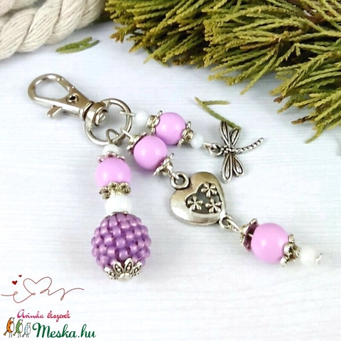 Lila szitakötő fűzött bogyós kulcstartó táskadísz anyák napja ballagás évzáró pedagógus karácsony szülinap névnap