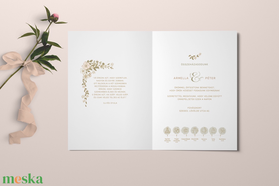 Armella kinyitható esküvői meghívó, idővonallal, virágos, vintage