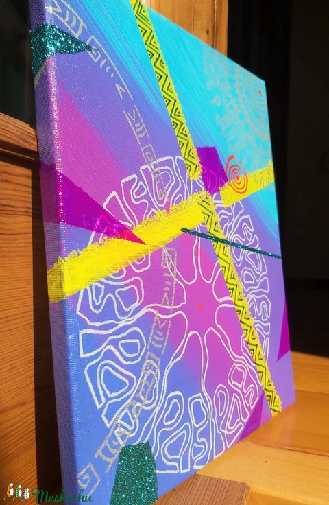 akril festék, keretre feszített vászon, lakk filc, csillámpor, fedő lakk