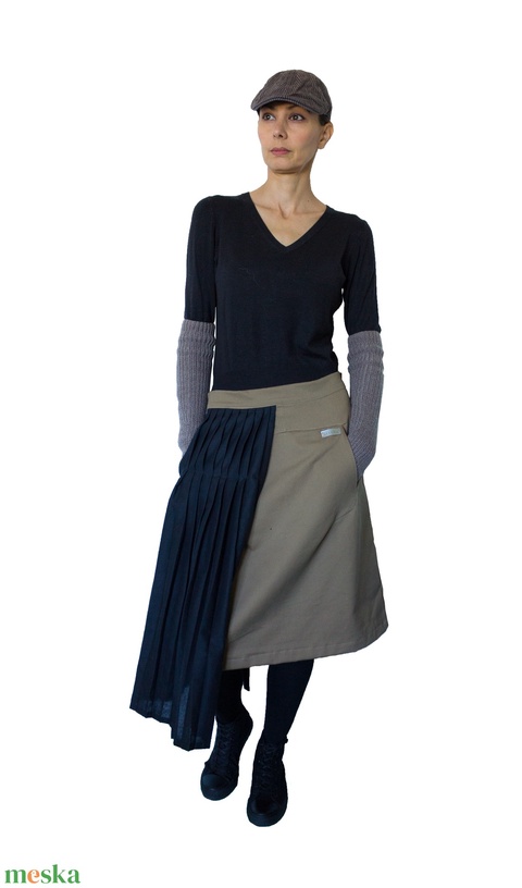 A fotón szereplő Arcana szoknya színei: camel vastag twill anyag és vékony fekete pamutvászon, berakásokkal tűzdelve.