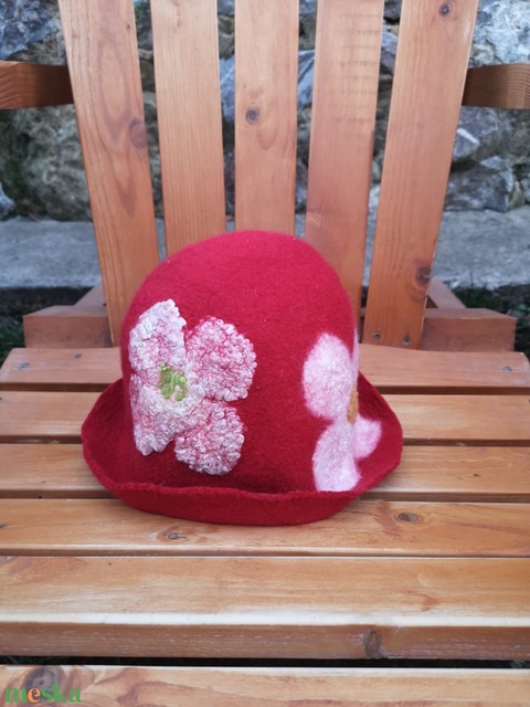 Piros virágos szaunakalap, szaunasapka, nemez kalap, nemez sapka