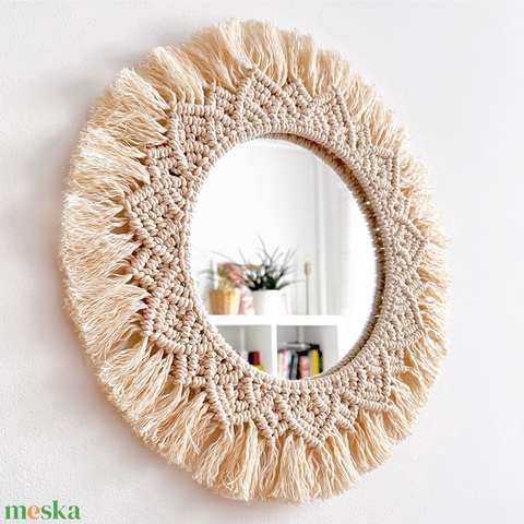 Bohém makramé mandala tükör - kör alakú, falra akasztható dekoráció