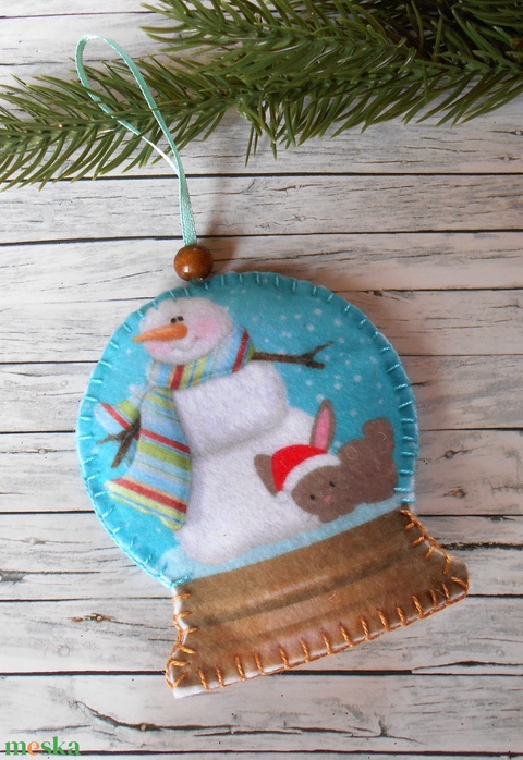 Különleges hógömb alakú karácsonyfadísz (nyuszis-hóemberes)