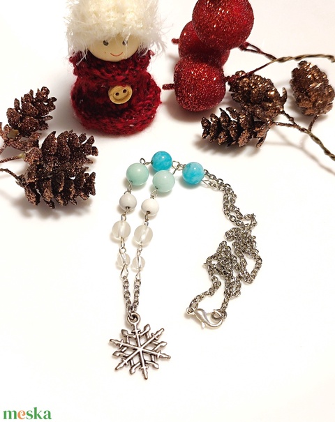 - Anyaga: amazonit, hegyikristály, howlit, ezüst színű lánc, ásvány, hópihe, hópehely medál