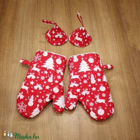 Piros alapon karácsonyi mintás edényfogó kesztyű és fedőfogó szett