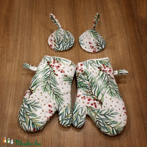 Natúr alapon fenyőfaágak edényfogó kesztyű és fedőfogó szett