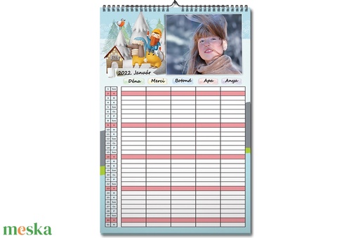 A családi rendező naptár egy olyan eszköz, amely 1 éven keresztül gyűjti össze családtagjaid tevékenységeit, programjait. Hiszen ki ne tudná milyen nehéz időnként a családot koordinálni ebben a rohanó világban, ahol rengeteg a tanfolyam, iskola utáni tevékenység, vagy hétvégi elfoglaltság. Mindenki saját oszlopban rögzítheti az eseményeket, átlátva így a másik programjait is. Minden hónap fényképes részét egyedi design teszi még vidámabbá.