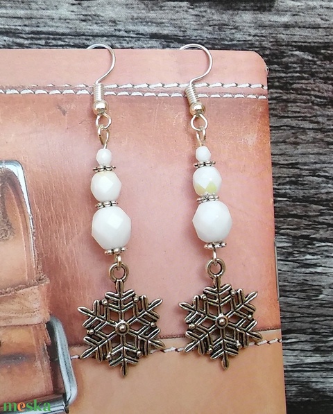 - Anyaga: csiszolt gyöngy, köztesek, horgas pálca, ezüst színű fülbevaló alap, hópihe charm, gyöngy