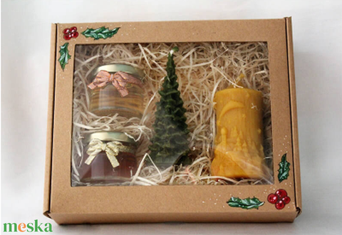Céges karácsonyi ajándéknak szuper kis díszdoboz. Egyedi, egészséges, különleges, fincsi, fajta mézekkel és csoda szép méhviaszgyertyákkal kitűnő, cuki ajándék akár kollégának, akár munkatársnak bármely családtagnak, barátnak.