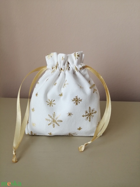 Fehér alapon aranyszínű, csillogó, hópehely mintás vászon ajándék zsákocska
