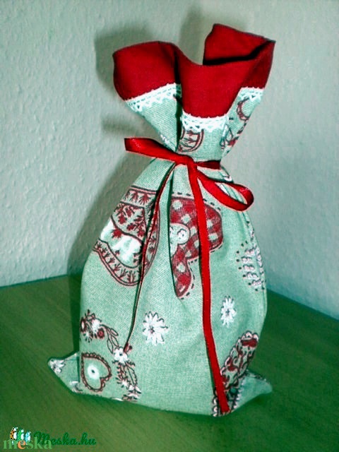 - Anyaga: mintás bútorvászon, piros pamutvászon, szaténszalag, csipke