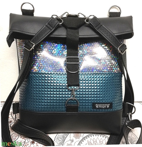 Roll top univerzális táska hátizsák fekete-türkíz-hologram