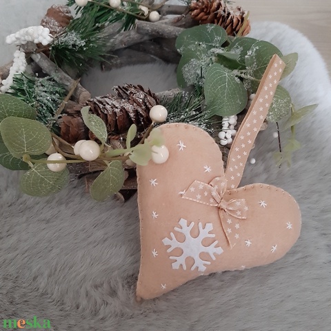Filc karácsonyfadísz - hópelyhes, bézs szívecske