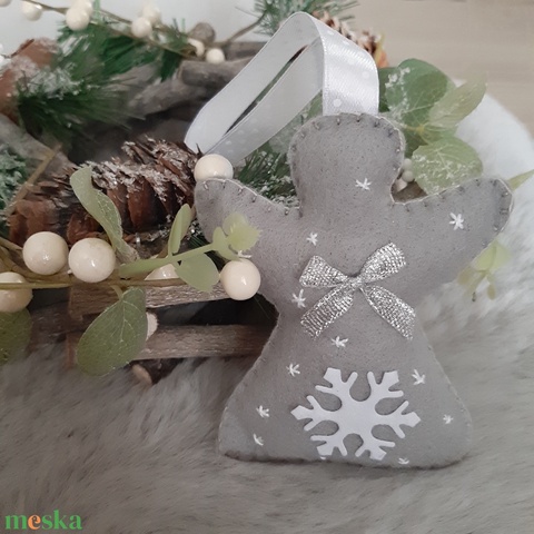 Filc karácsonyfadísz - hópelyhes, szürke angyalka