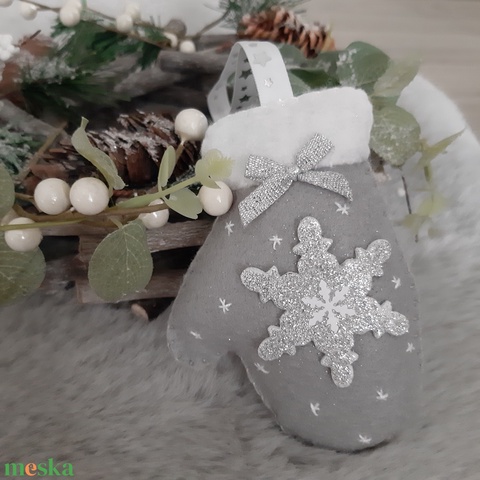 Filc karácsonyfadísz - hópelyhes, szürke kesztyű