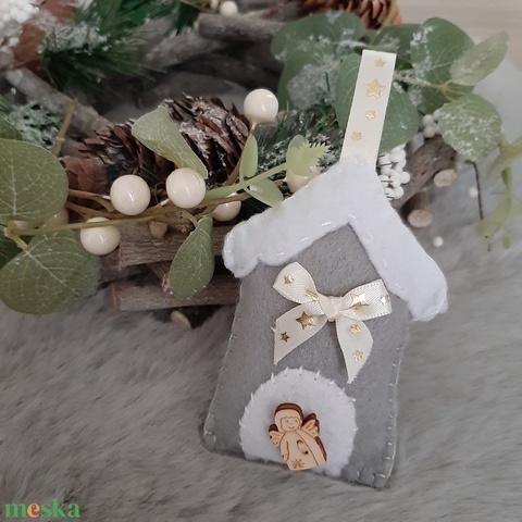 Filc karácsonyi dísz - szürke házikó angyalkával