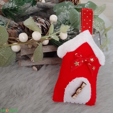 Filc karácsonyi dísz - piros házikó szaloncukorral