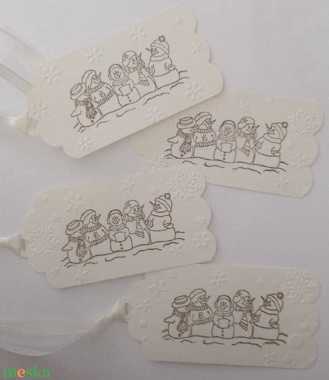 Vidám hóemberek - ajándékkísérő - téli családi ünnepekre - születésnap, névnap - ajándékkártya -dombormintás hópelyhek